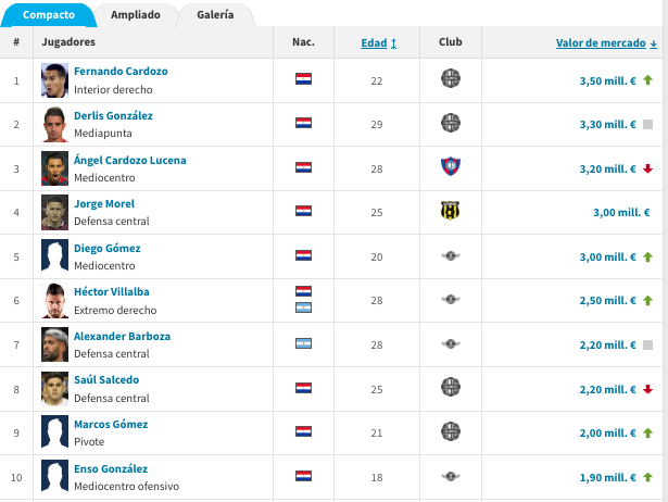 También aparece Jorge Morel, cuyo pase pertenece a Guaraní, con un valor de 3 millones de euros. En el top 10 también están figuras de Libertad, como Diego Gómez (3 millones de euros), Héctor Villalba (2.5 millones de euros) y Alexander Barboza (2.2 millones de euros).