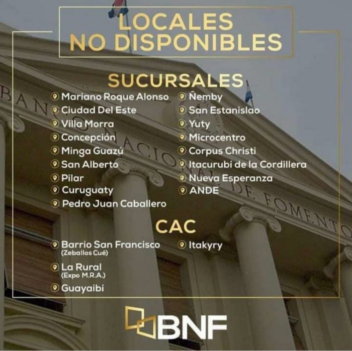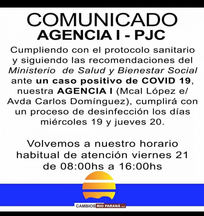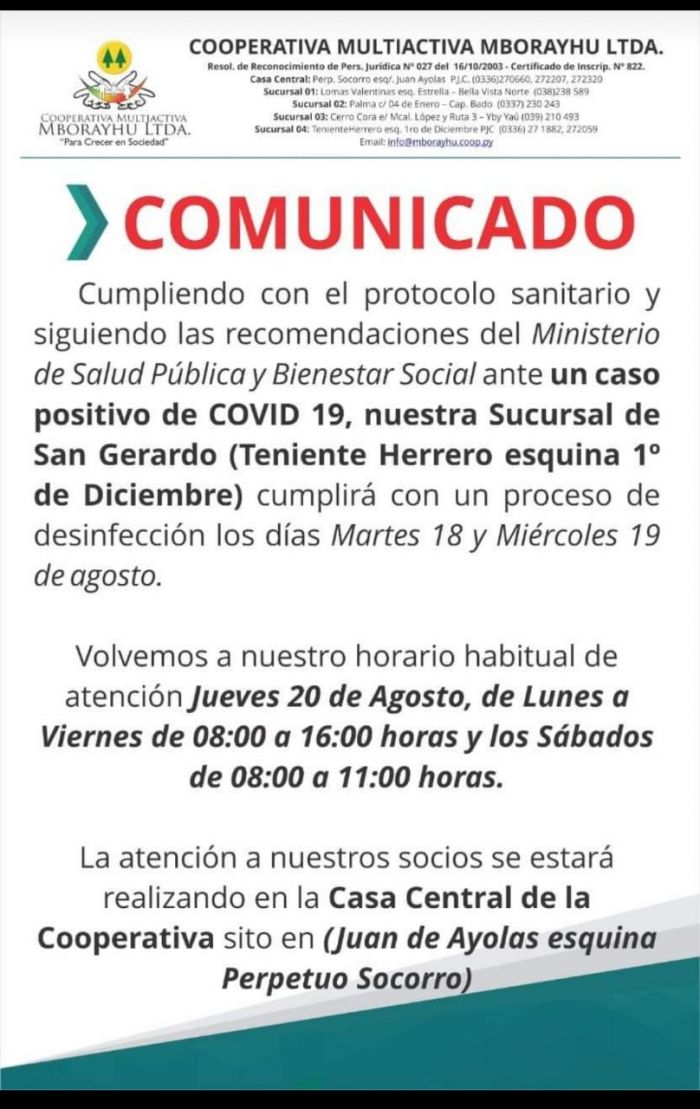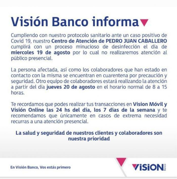 También dos Bancos de esta ciudad quitaron un comunicado del cierre de su puertas al público por casos de Coronavirus, tanto el Banco Nacional de Fomento y Visión Banco volverán a operar desde el jueves luego del proceso de desinfección de sus locales.