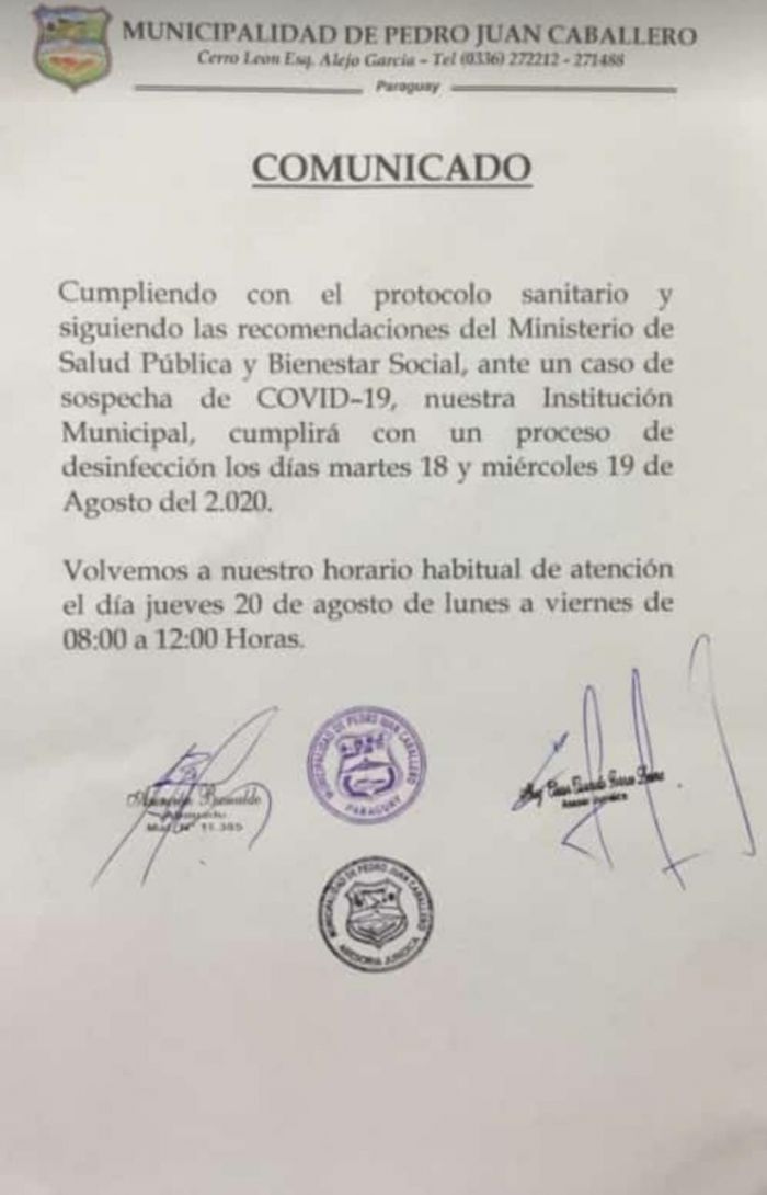 El Ministerio Público de Pedro Juan Caballero también cerró sus puertas al público por las medidas sanitarias establecida en el protocolo ante casos positivos o sospechosos del virus, la institución pasará por un proceso de desinfección y las personas afectadas ya se encuentran en cuarentena.